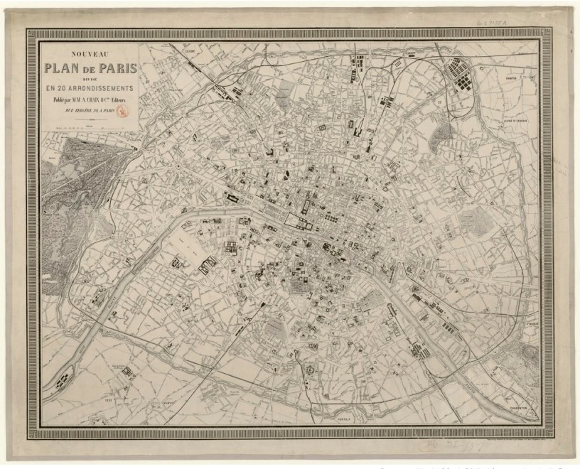 Lorsque le besoin d’un plan de Paris en 1871 se fait sentir, j’utilise celui-ci, qui est beau, clair, date de 1870, et se trouve en ligne sur Gallica. Le zoom de Gallica permet d’examiner tel ou tel détail. Malheureusement, le fichier téléchargé n’a pas une résolution excellente. Pour le voir en ligne, cliquer ici.