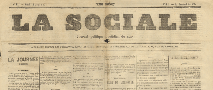 Il n’est pas facile de lire La Sociale. Je n’en ai trouvé les numéros sur aucun site. J’ai hésité à m’inquiéter qu’il n’y ait pas (à ce jour) de page wikipedia qui soit consacrée à ce journal. J’ai même eu la mauvaise pensée que c’était bien parce que l’auteur de la page wikipedia sur la Commune de Paris croyait (ce jour) que La Sociale était le journal de « la féministe André Léo » qu’il n’y avait pas de page sur ce journal.