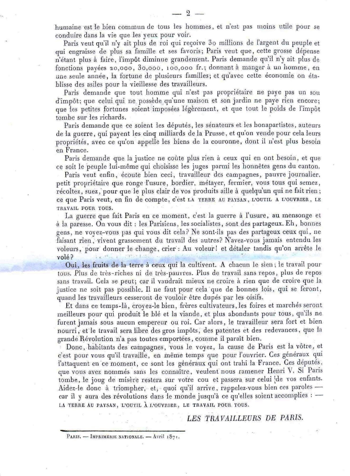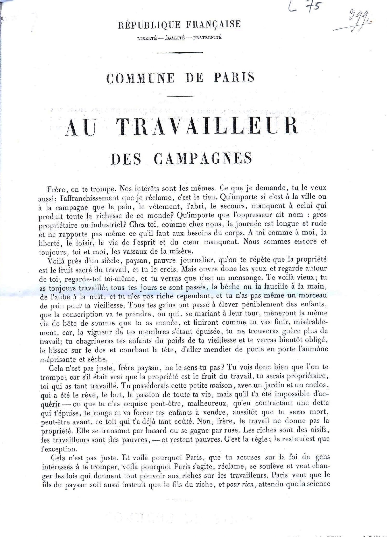 Le tract dont j’ai donné le texte dans un article précédent, envoyé par ballons vers la province — car, à quoi bon le publier dans des journaux bloqués à Paris, quel travailleur de la campagne aurait pu le lire? — en voici un exemplaire. Qui est arrivé entre les mains d’un architecte d’Auxerre, Émile Lorin (1815-1902) qui, justement, était collectionneur de tracts. Émile Lorin fut maire (élu) d’Auxerre de 1882 à 1884. On peut donc imaginer qu’il était attaché à sa ville. En tout cas c’est à la Bibliothèque municipale d’Auxerre que sont aujourd’hui ses collections, feuilles volantes reliées en volumes. Dans le soixante-quinzième volume (!) se trouve l’appel « Au travailleur des campagnes » (cote L – 75 – 399).