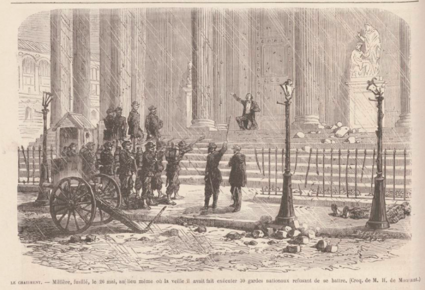 Je l’avais copiée sur le site Paris Révolutionnaire, où elle n’avait ni source ni nom d’auteur. Il existe, à ma connaissance, deux images de la mort de Millière. Sur l’une, parue dans Le Monde Illustré du 10 juin 1871, on voit Millière d’assez loin, il est à genoux, il pleut, les soldats vont tirer, le nom de l’auteur est indiqué.