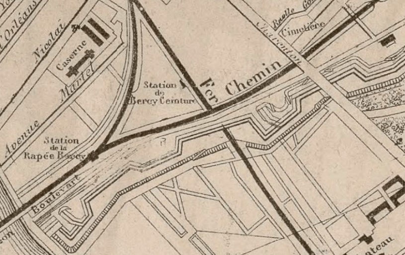 C’est toujours le même plan de Paris que l’on voit en couverture de cet article. Le cimetière de Bercy est en haut à droite. Un petit pan de mur des fortifications, en bas à droite au bord de la Seine, subsiste aujourd’hui — entre échangeurs du périphérique et de la voie expresse.