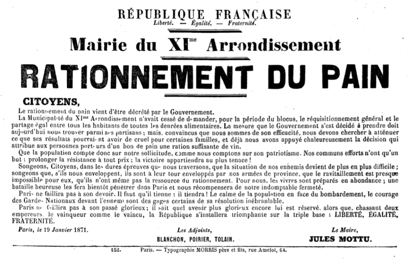 Le 19 janvier, il se réjouit que le Gouvernement ait enfin décrété le rationnement du pain, c’est-à-dire le partage entre tous, que la municipalité de l’arrondissement ne cesse de réclamer.
