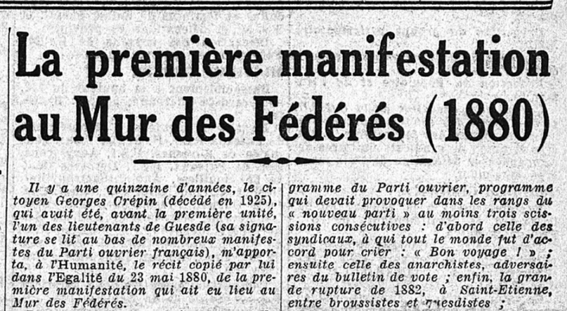 Il y a une quinzaine d’années, le citoyen Georges Crépin (décédé en 1925), qui avait été […] l’un des lieutenants de Guesde […], m’apporta à L’Humanité, le récit copié par lui dans L’Égalité du 23 mai 1880, de la première manifestation qui ait eu lieu au Mur des Fédérés.