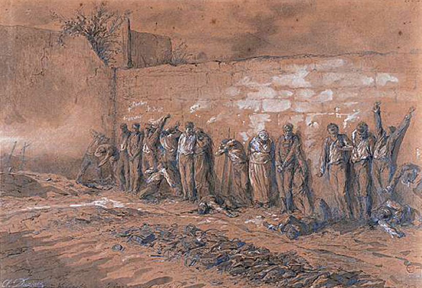Alfred Darjou, auteur de ce dessin réaliste au titre précis, Exécution des derniers communards, au cimetière du Père Lachaise, le 28 mai 1871, n’était bien entendu pas présent ce jour-là en ce lieu.