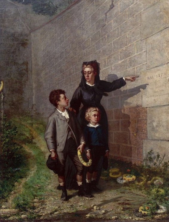Les deux enfants tiennent une couronne. Il y en a d’autres à terre. Évoquant des hommages nombreux mais discrets — malgré la netteté de l’ombre sur le mur, l’image est sombre, presque clandestine. Le tableau s’intitule La Veuve du fusillé. Après la mort effroyable des héros, leur mémoire.