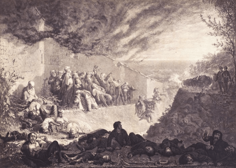 Au fond, une muraille. Devant elle, acculé dans un coin, un groupe nombreux de femmes, d’hommes et d’enfants. À leurs pieds, une fosse profonde. Au premier plan, des cadavres, en particulier d’enfants, et des agonisants. Parmi eux, un homme vivant, qui regarde. C’est une batterie de canons qui va faucher ces nouvelles victimes. Au-dessus de cette scène, un ciel d’apocalypse. Fumée d’un incendie derrière le mur? Nuages?