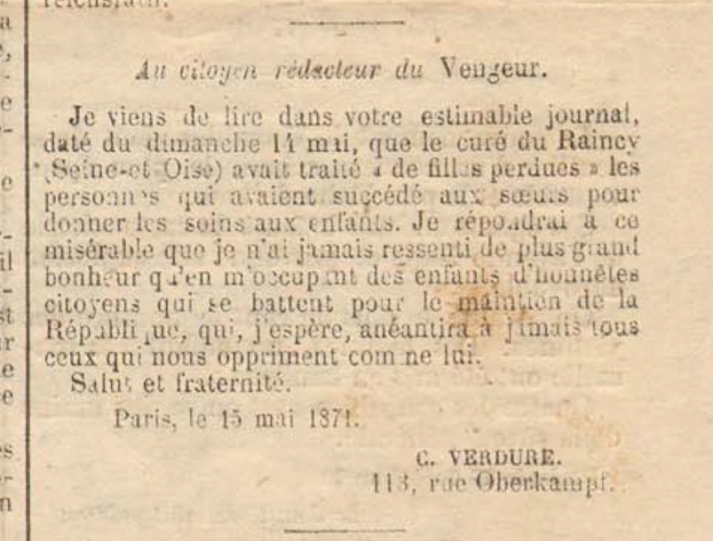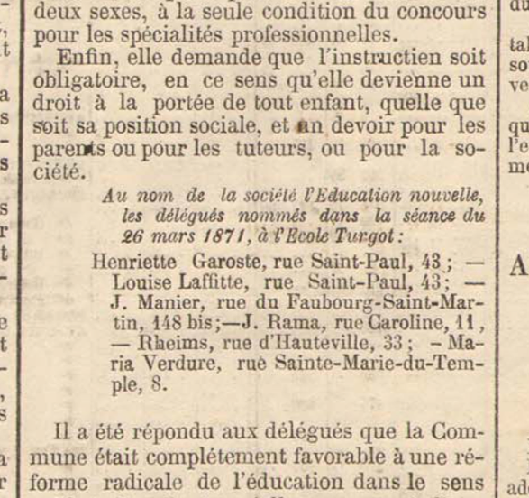 Maria Verdure (et pas « Marie Laverdure », comme elle est appelée dans l’introduction du petit dictionnaire — et pas non plus « Maria ou Marie », comme il est dit dans la note qui lui est consacrée). Maria Verdure. Et même Maria Iphigénie Glorvina Verdure. Elle vit, avec ses parents, rue Sainte-Marie-du-Temple, 8 (cette rue s’appelle aujourd’hui rue de la Présentation, elle est dans le onzième arrondissement au Faubourg-du-Temple). Et pas rue Oberkampf, 113, comme il est dit dans la note à elle consacrée. Elle apparaît dans le Journal Officiel du 2 avril, comme le dit cette même note, et elle y apparaît (avec son adresse) parce que, avec d’autres, femmes et hommes, délégués de la société l’Éducation nouvelle, elle a porté à la Commune une requête sur l’éducation.