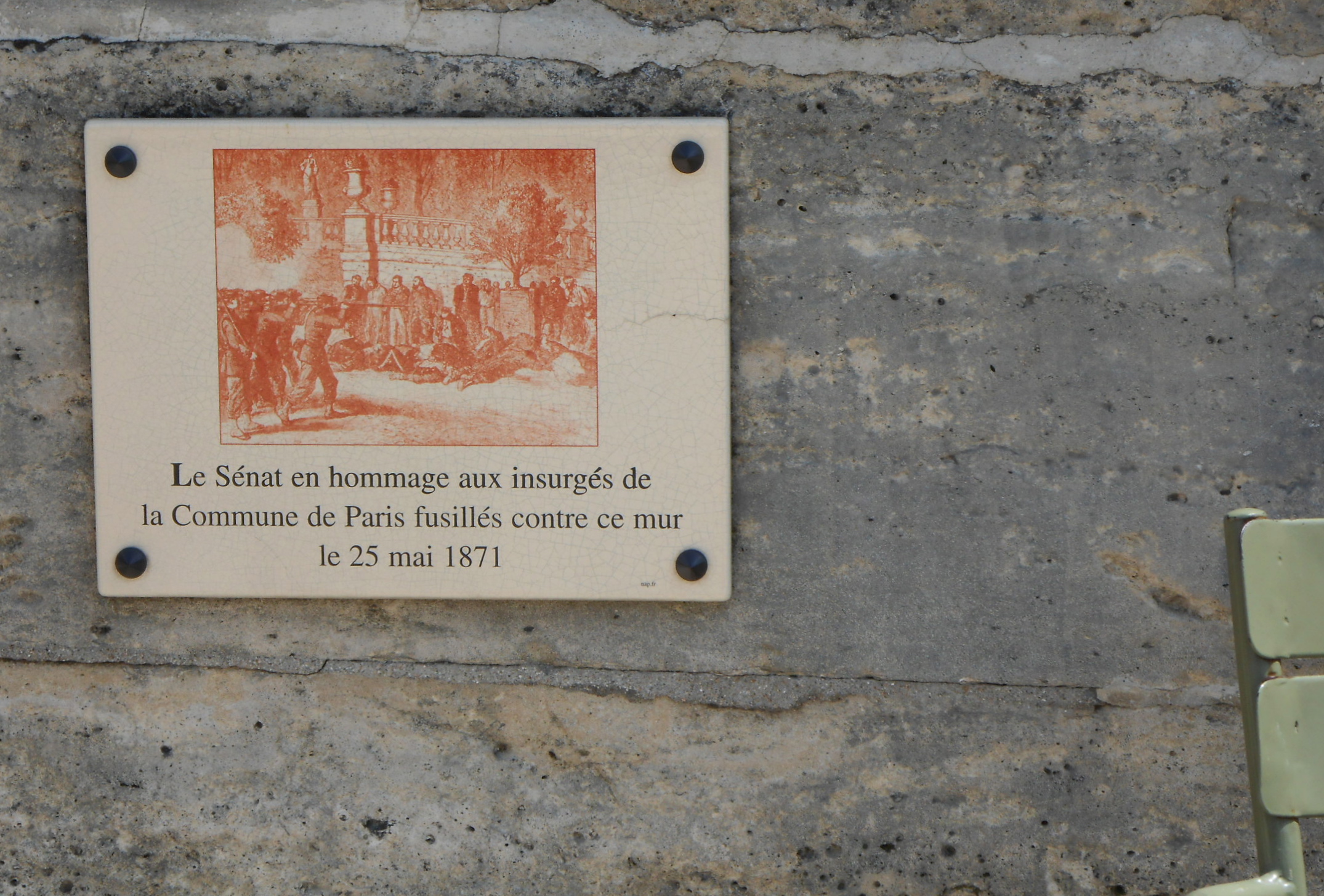 La plaque est discrète. Elle n’est pas datée, mais elle est assez récente. Le texte est étrange, comme d’habitude. Le 25 mai? Pourquoi le 25 mai? Et ceux fusillés les autres jours? Tony-Moilin parmi tant d’autres dont on ne put reconnaître les corps, c’était le 28 mai. Beaucoup des pierres ont été remplacées. Certains des trous que l’on voit dans le mur sont peut-être même des traces de balles. Parfois je me demande si le sable est toujours le même. S’il y reste du sang.