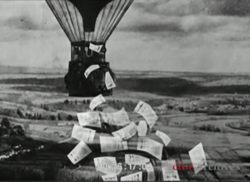 L’image que j’ai utilisée comme couverture de cet article est aussi une image du film, on aura reconnu un ballon « distribuant » le tract « Au travailleur des campagnes », ou Frère on te trompe.