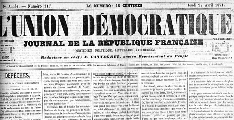 Dans un article récent, j’ai évoqué le blocus que Thiers avait fait subir à Paris pendant la Commune, notamment en empêchant les nouvelles de Paris d’arriver en province. Aux quatre articles de Paul Lafargue parus dans La Tribune de Bordeaux, j’ajoute aujourd’hui deux lettres d’André Léo, datées des 6 et 11 avril, et publiées dans le numéro du 27 avril de L’Union démocratique, un journal nantais « ultra-républicain ».