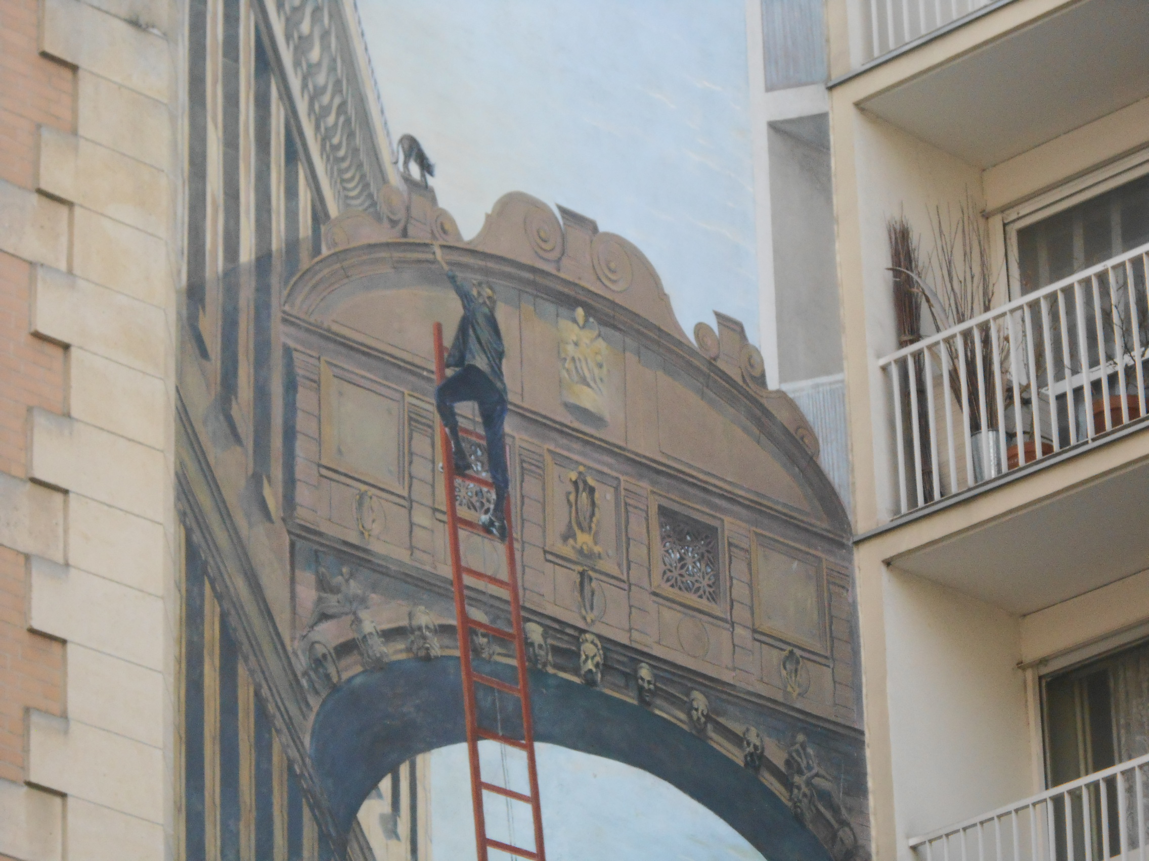 Tout en bas de cette rue sinistrée, en arrivant au métro Saint-Fargeau, il y a quand même une assez belle chose. Éphémère. Sans rapport avec la Commune. Je l’ai photographiée plusieurs fois et, chaque fois, j’ai eu des commentaires des passants qui, clairement, sont fiers qu’on vienne la photographier. Par amour pour les quartiers populaires et respect pour les rues déshéritées, j’ai utilisé une de ces photos pour en faire la couverture de cet article. Rue Haxo, un pompier monte sur sa grande échelle pour sauver un chat coincé sur… le pont des Soupirs. Voici un détail.