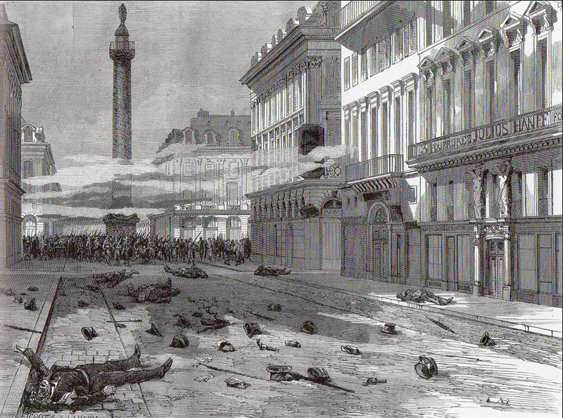 Charles Longuet m’avait montré une gravure. Pas une photographie. Aucune photo ne montre le mouvement de la Commune. Les photos étaient encore très posées. Il fallait s’immobiliser pendant plusieurs secondes. Cette gravure était parue dans l’hebdomadaire L’Illustration. Je l’ai retrouvée à la bibliothèque. C’est plus une image de fuite éperdue qu’une image d’émeute. La rue de la Paix immobile après la bataille aurait même pu être photographiée, une vraie nature morte, à terre six cadavres, des chapeaux, des cannes et même un revolver au premier plan. Au fond, l’artiste a représenté la place, les gardes, leurs baïonnettes et un peu de fumée qui flotte dans l’air. Le dessin est signé André Lançon. Ce dessinateur, qui faisait partie de la Fédération des artistes, a été emprisonné pendant six mois après la Commune.