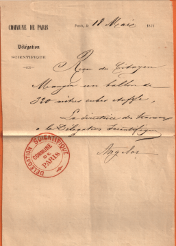 Cette dame est arrivée chez moi par un « ramasseur de souvenirs », comme il se définit lui-même. À des libraires, sur des marchés aux puces, dans des brocantes, sur internet ou ailleurs — les collectionneurs ont leurs secrets — il a acheté des dizaines de milliers (je n’exagère pas) de livres, documents, objets… C’est d’une de ces façons qu’il a acquis une petite feuille à entête de la Délégation scientifique, avec un beau tampon rouge, datée du 18 mai 1871, et une photographie. Ah! je ne vous avais pas dit que le domaine d’intérêt, la passion de ce collectionneur, c’est la Commune de Paris. La petite feuille, parmi des milliers d’autres vieux bouts de papier (je le dis avec respect), est un reçu.