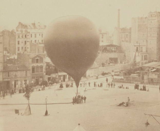 Il faudrait faire l’histoire des ballons de la Commune, ceux qui ont emporté des tracts, au travailleur des campagnes, Frère on te trompe, des proclamations, de la Commune, des francs-maçons… mais dont il semble qu’ils n’aient servi ni pour faire la guerre, ni même pour aider des communards à quitter Paris. Et d’ailleurs, 320 mètres cubes, c’est bien petit pour emporter des passagers. Par exemple, pour fixer les idées, le ballon le Neptune, parti le 23 septembre 1870 de la place Saint-Pierre (et que l’on voit en couverture de cet article) en faisait mille trois cents.