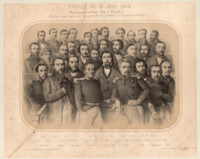 C’est de cette époque et de ce procès que date le portrait qui sert de couverture à cet article, que j’ai extrait d’un portrait collectif des accusés du procès du 13 juin 1849 (trouvé sur Gallica, là) que voici:
