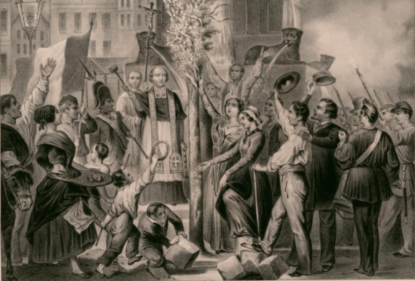 L’image, un arbre de la liberté, vient de Gallica, là. Je n’ai pas trouvé celui de la cité Trévise, j’ai choisi cette image parce qu’elle ne comportait pas que des curés et des hommes.