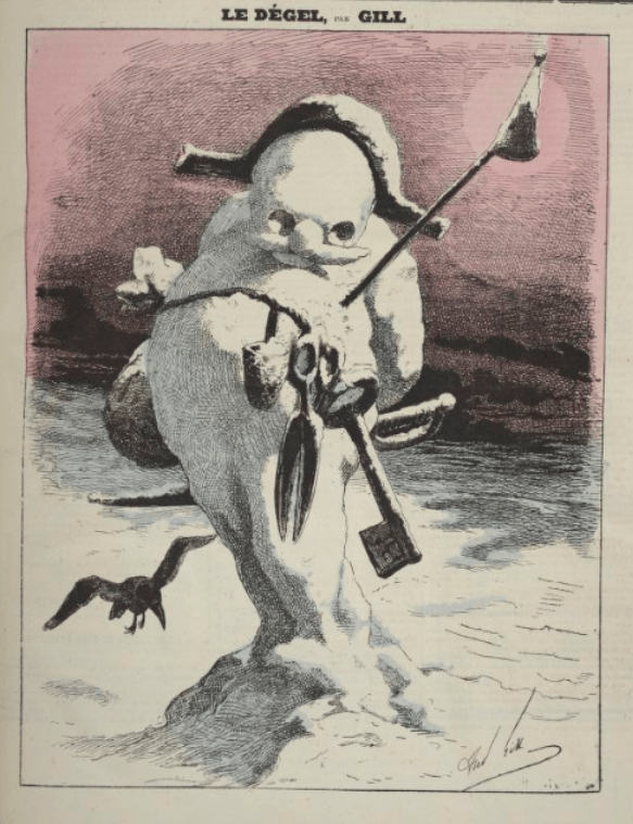 En couverture, le Dégel, par Gill, dans l’Éclipse du 12 décembre 1869, qui est sur Gallica, là. Dois-je expliquer cette image?