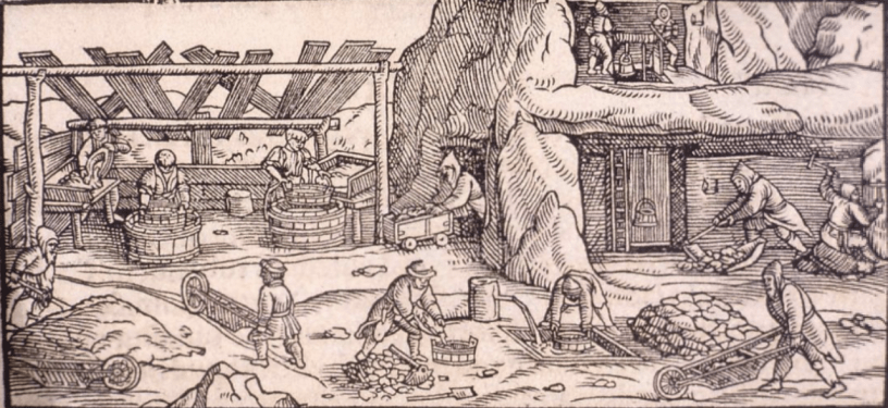 La gravure représentant le travail dans une mine au seizième siècle vient de la Bibliothèque nationale universitaire de Strasbourg, via Gallica, là.