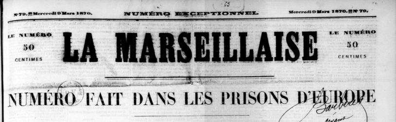 Comme annoncé dans les articles 1 (automne 1869), 2 (Rochefort), 3 (Varlin), 4 (les journalistes et la Commune) et comme présenté dans l’article 0 (Demain), voici la Marseillaise, quotidien, quotidiennement.