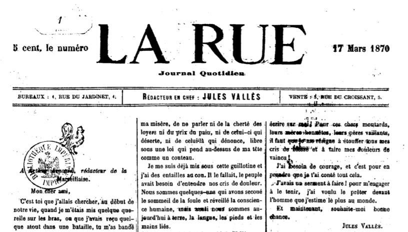 Le premier numéro de la nouvelle Rue, de Jules Vallès, sert de couverture à cet article. Félicitons-nous en, les vingt-sept numéros de ce journal quotidien sont sur Gallica, là. Avec une introduction et des sommaires, ils sont aussi là. Souhaite-moi bonne chance, demande Vallès à son ami Arnould dans son premier article.