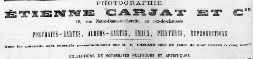 et je remarque l’apparition d’une belle annonce publicitaire pour Étienne Carjat (reproduite ci-dessus).