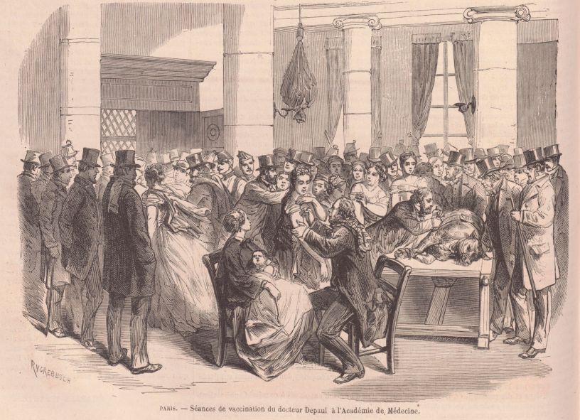 L’image de la séance de vaccination est parue dans Le Monde illustré du 19 mars 1870, on la trouve sur Gallica, là.
