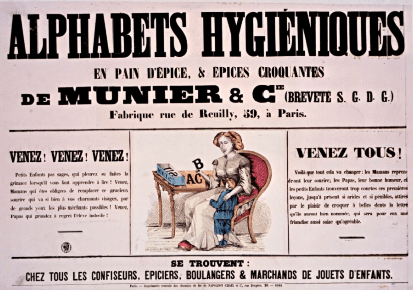 L’affiche publicitaire qui sert de couverture à cet article (pain d’épice et éducation!) date de 1860 et se trouve sur Gallica, là.