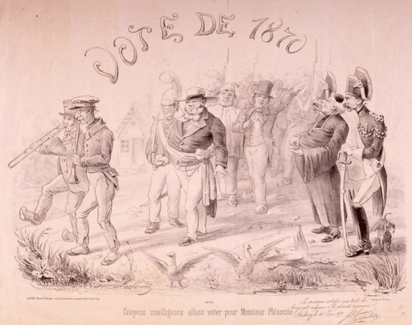 Comment vouliez-vous que je résiste à cette magnifique image de « citoyens intelligents allant voter pour Monsieur Plébiscite » sous la surveillance du curé et du garde-champêtre? Ouf, les citoyennes sont restées à la maison! Ça se passe en Alsace (et à la campagne), ça vient de la Bibliothèque nationale universitaire de Strasbourg, via Gallica, là.