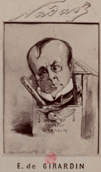 La caricature de Girardin est une photo de l’atelier Nadar, que j’ai trouvée sur Gallica, là.