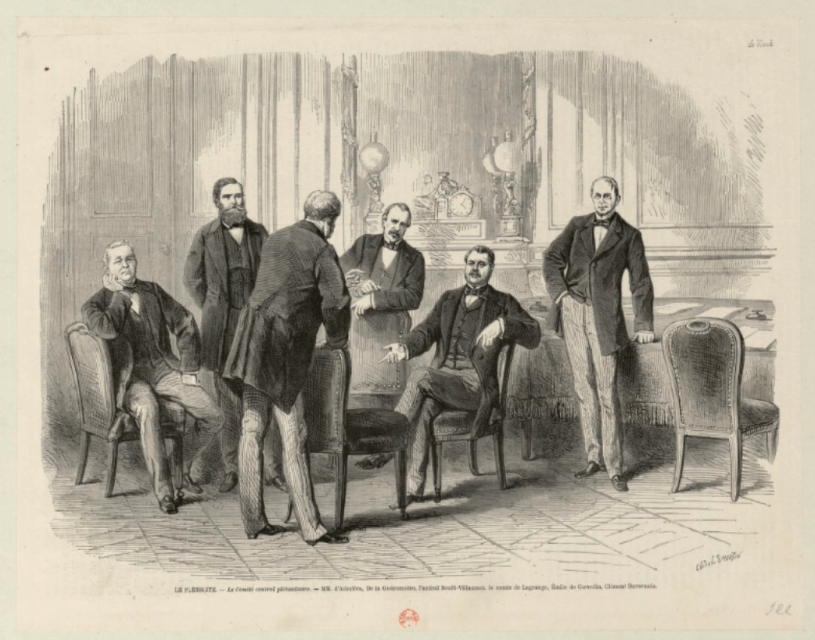 L’image de couverture représente le Comité central plébiscitaire, la droite bonapartiste, en les personnes de MM. d’Albuféra, de la Guéronnière, Bouët-Villaumez (un amiral), de Lagrange (un comte), et les journalistes Émile de Girardin et Clément Duvernois (qui devait regretter de ne pas s’appeler Du Vernois). Jean-Pierre Bonnet me propose l’identification suivante, de gauche à droite et de face, Bouët-Villaumez, Duvernois, de la Guéronière, d’Albuféra, Girardin, et de dos Lagrange. J’ai trouvé cette estampe sur Gallica, là.