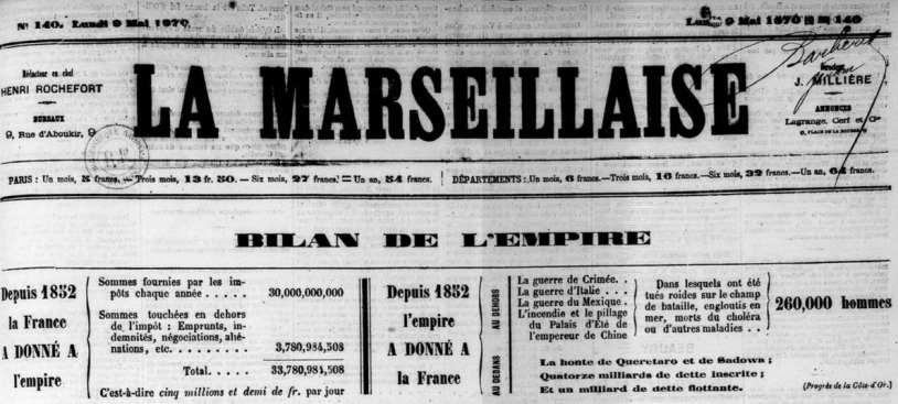 Comme annoncé dans les articles 1 (automne 1869), 2 (Rochefort), 3 (Varlin), 4 (les journalistes et la Commune) et comme présenté dans l’article 0 (Demain), voici la Marseillaise, quotidien, quotidiennement.