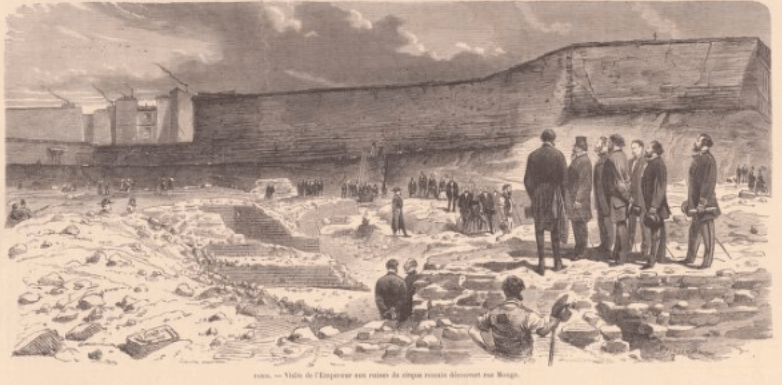 La gravure représente l’empereur visitant ce que l’on appelle aujourd’hui les arènes de Lutèce et que l’on venait de découvrir. Elle est parue dans Le Monde illustré du 23 avril 1870, lequel est sur Gallica, là.