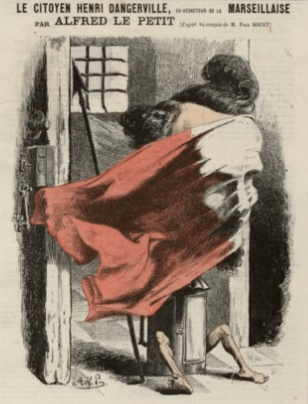 C’est dans La Charge datée du 28 mai 1870 qu’Alfred Le Petit a publié ce portrait de Dangerville assis sur une lanterne à la Rochefort, il était en effet grand temps de révéler les traits du mystérieux collaborateur de la Marseillaise, j’ai trouvé l’image sur Gallica, là.