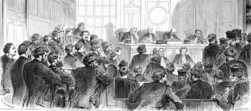 Il y a trente-huit prévenus. Dix-neuf sont inculpés d’avoir, depuis moins de trois ans, à Paris, comme chefs ou fondateurs, fait partie d’une société secrète. Parmi ceux-ci, trois sont des condamnés du « deuxième procès » de 1868, ce sont Varlin, Malon et Combault. Les dix-neuf autres sont inculpés d’avoir été membres de la même société secrète. Avant de donner les listes de ces dangereux individus, voyons comment ils arrivent au tribunal.