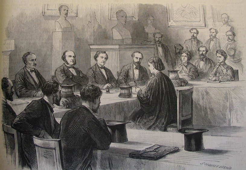 La gravure utilisée en couverture représente la soutenance de la thèse d’Elizabeth Garrett, elle est parue dans L’Univers illustré daté du 25 juin 1870. Merci à Natalie Pigeard-Micault de me l’avoir envoyée.