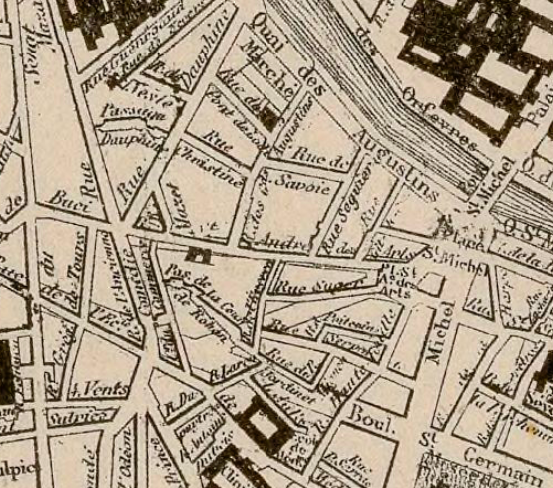 Vous ne voyez pas? Ces deux rues, de même que l’impasse du Paon, qui donnait dans la rue Larrey, ont disparu lors du prolongement du boulevard Saint-Germain vers l’ouest au-delà du boulevard Saint-Michel (la décision de ce prolongement fut prise en 1866, mais il ne fut réalisé que vers 1875).