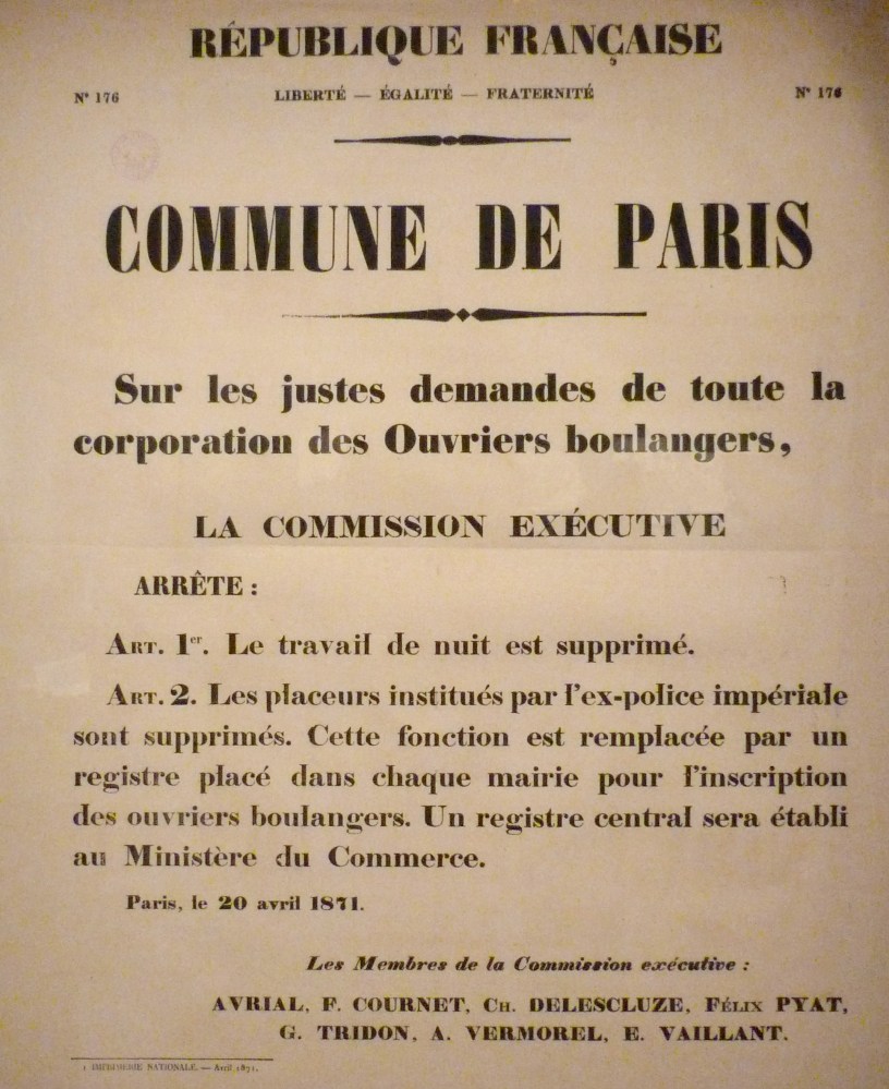 Ceci est le premier article d’une série de trois consacrés à la question du travail de nuit des boulangers, qui fut l’occasion d’un des débats les plus intéressants (à mon goût) à la Commune de Paris. Par anticipation, voyez le décret du 20 avril 1871 sur l’image de couverture (voir les sources en fin d’article).