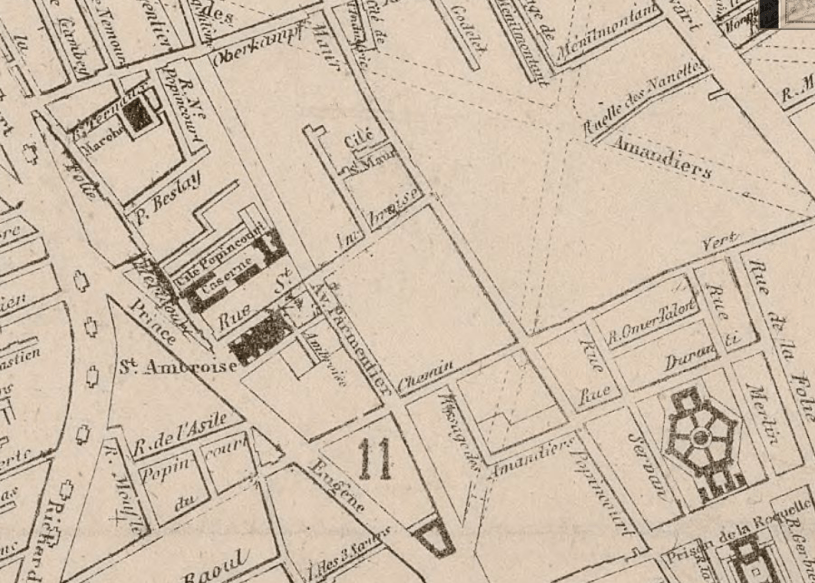 La vaste cité ouvrière est peut-être la cité Saint-Maur, que l’on voit sur le plan en couverture de cet article. Le ciseleur B… offre aux fugitifs une de ses deux pièces.