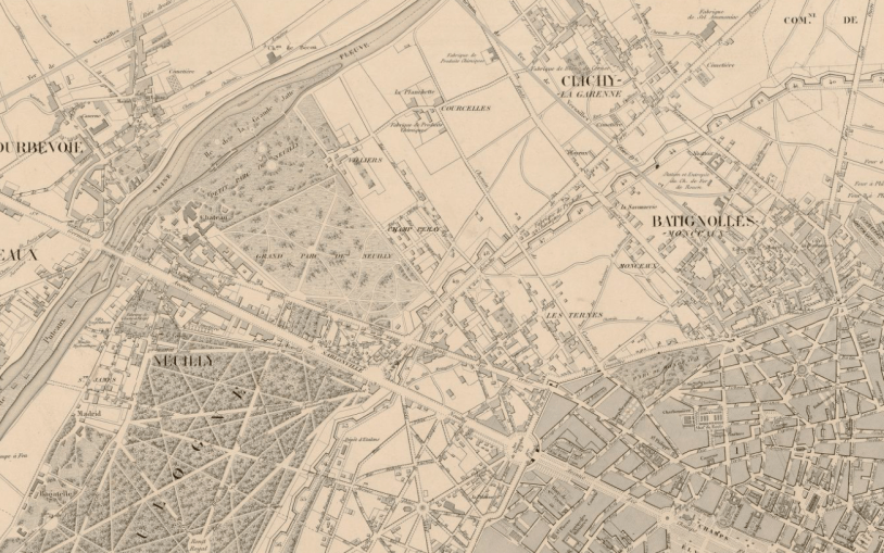 Levallois, cette fois (même si le nom n’est pas indiquée), et le trou blanc à l’ouest de Clichy qui est sans doute la plaine noire où Alix a eu peur, toujours sur le même plan, qui vient toujours de Gallica.