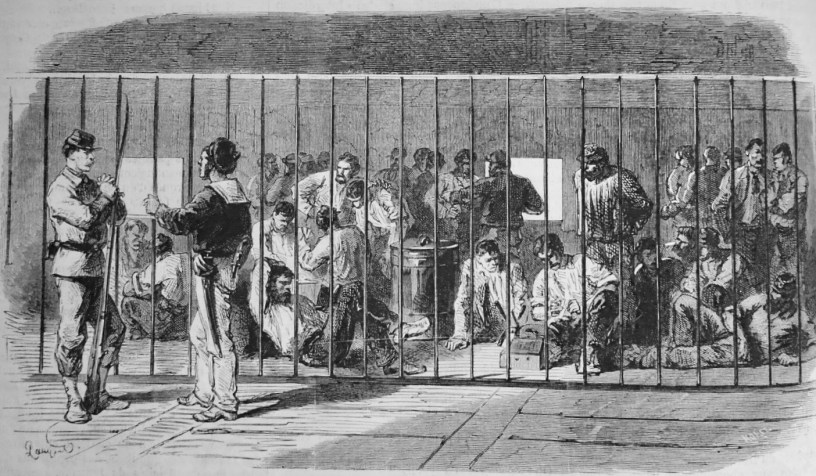 On a fait sur ces pontons une installation qui n’existe pas sur les autres et qui consiste en une sorte de grand compartiment avec barreaux au centre du navire, avec un passage en abord où se promènent les factionnaires. Cela permet de surveiller les détenus, et en même temps de laisser toujours les sabords grand ouverts ; une petite pièce de canon en cuivre enfile toute la galerie.