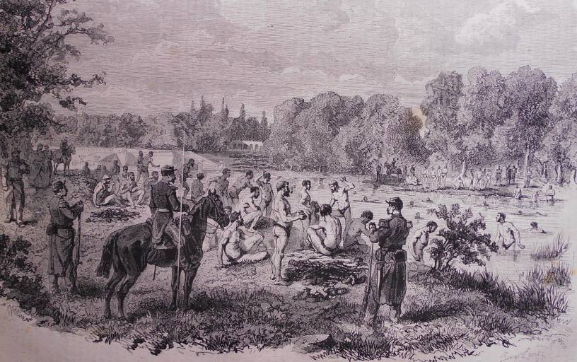 L’image champêtre et paisible (les hommes à cheval sont des gardiens, si, si) de la baignade au Trianon vient du journal L’Illustration à l’automne 1871 (une photographie que j’ai faite sur le volume conservé par la Bibliothèque nationale de France). Son titre complet est: « Les prisonniers de la Commune à Versailles — la Baignade au grand Trianon ». Il est vraisemblable que cette « baignade » était aussi la seule chance qu’avaient ces prisonniers de se laver… On va voir que la réalité était moins idyllique, en particulier du côté des prisons pour femmes.