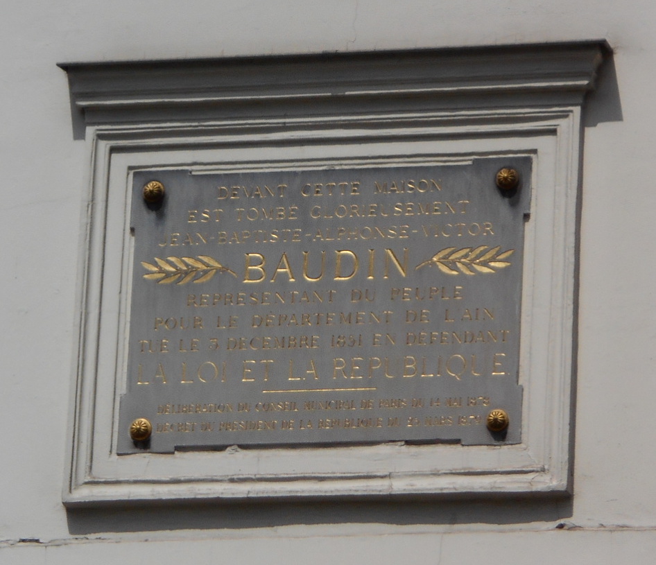 encore une vérité bien édulcorée sur la plaque (4 rue du Faubourg-Saint-Antoine). Noter que le Génie de la Liberté, lui, regarde dans le même sens que les insurgés… Et puis il y a eu Baudin, député tué sur une barricade en s’opposant au coup d’état bonapartiste du 2 décembre 1851, au coin de la rue Sainte-Marguerite (Trousseau) et du Faubourg — noter