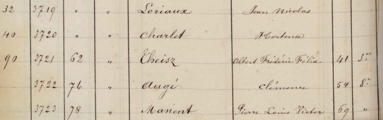 (Comme toujours, vous pouvez cliquer sur l’image pour l’agrandir, le nombre 41 désigne l’âge, les autres nombres sont des numéros d’ordre. N’hésitez pas à aller regarder le registre sur le site des Archives de Paris, en suivant le lien au début de cet article.)