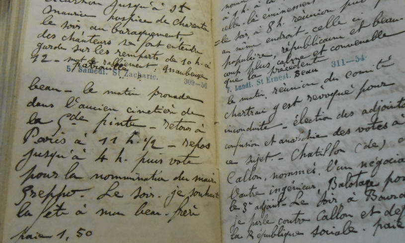 Lundi 7. Beau. le matin, réunion du comité. Chartrain y est révoqué pour inconduite. élection des adjoints, confusion et anarchie des votes à ce sujet. Chatillon (de) et Callon, nommés. l’un négociant, l’autre ingénieur. Balotage [sic] pour le 3e adjoint. Le soir à Bourdon je parle contre Callon et définit [sic] la République sociale. paie 3.