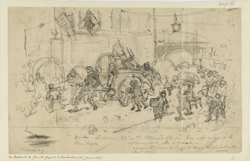 L’image de couverture est un dessin de Daniel Vierge, ce sont des habitants de Grenelle qui fuient le bombardement. Je l’ai trouvée sur le site du Musée Carnavalet, là.