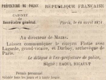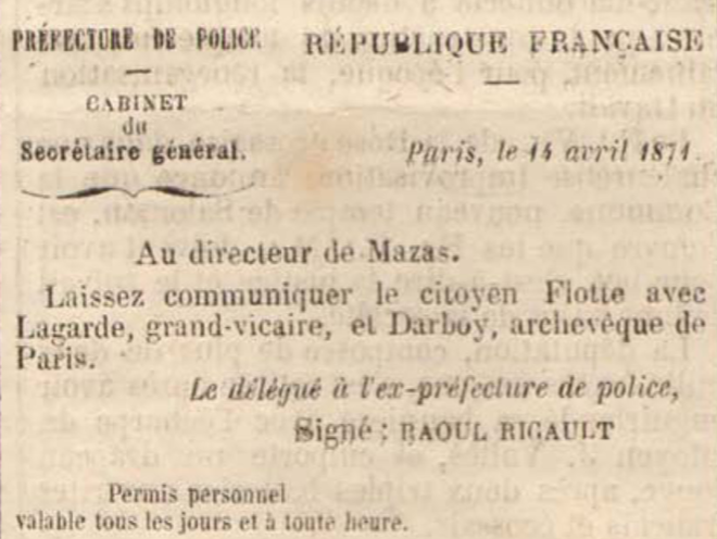 Le citoyen Flotte, ancien compagnon de cachot de Blanqui, son ami depuis de longues années, se chargea de cette mission difficile. Il entreprit d’aller trouver l’archevêque Darboy, détenu à Mazas, et de jeter avec lui les bases d’un échange possible. Le citoyen Raoul Rigault, délégué à l’ex-préfecture de police, lui remit le laissez-passer suivant (que nous avons entre les mains, ainsi que toutes les autres pièces publiées dans la suite de cet article)