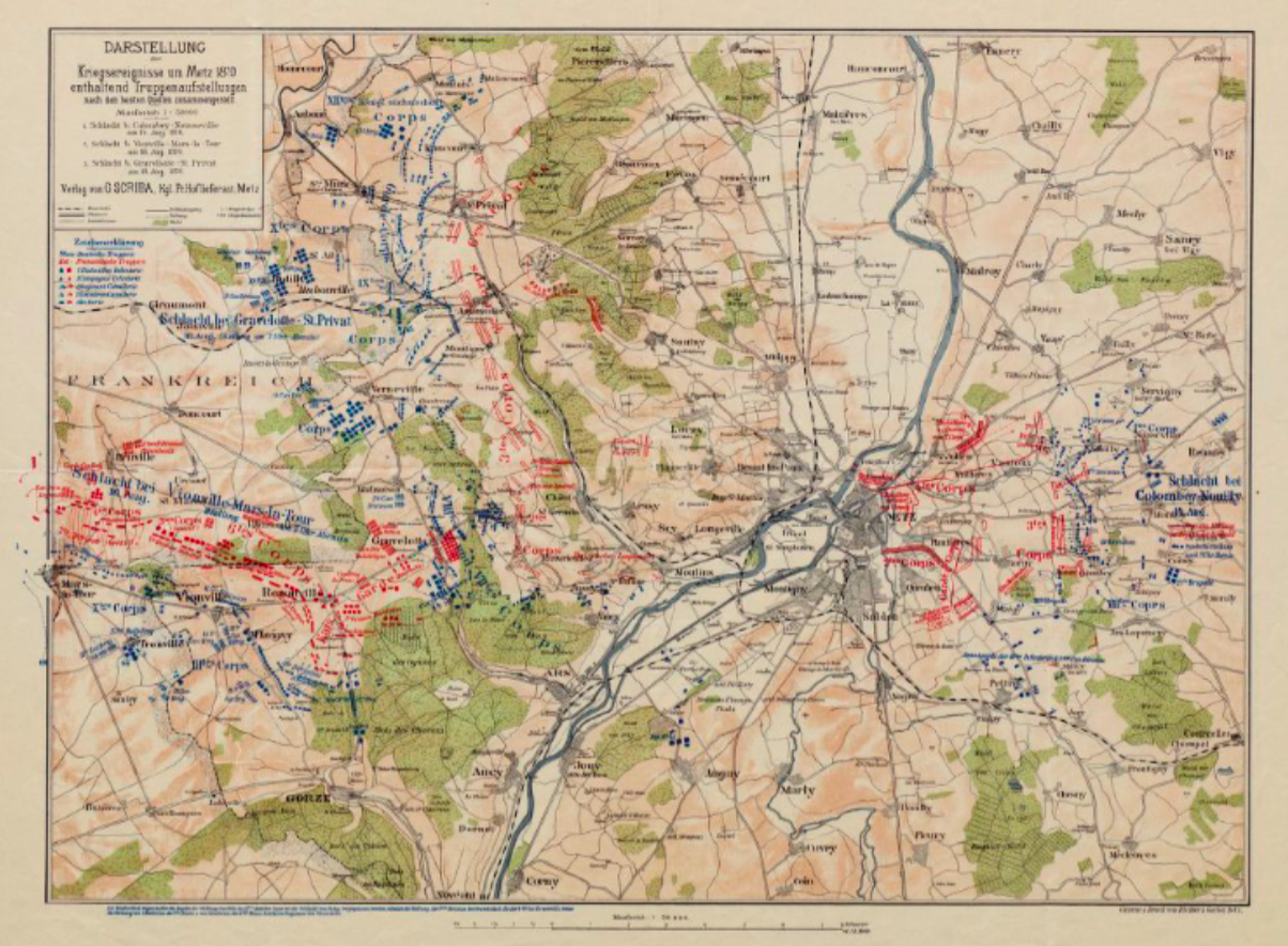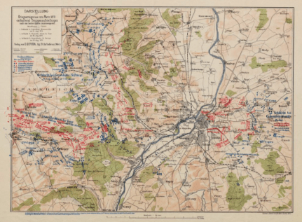 J’ai trouvé la carte allemande des environs de Metz pendant la guerre que j’ai utilisée comme couverture sur Gallica, là, mais elle vient de la Bibliothèque nationale universitaire de Strasbourg. Ce qui nous rappelle, pendant ces manœuvres politiciennes (et parisiano-centrées), la situation dramatique de ces deux villes, Metz et Strasbourg, et de leurs régions.