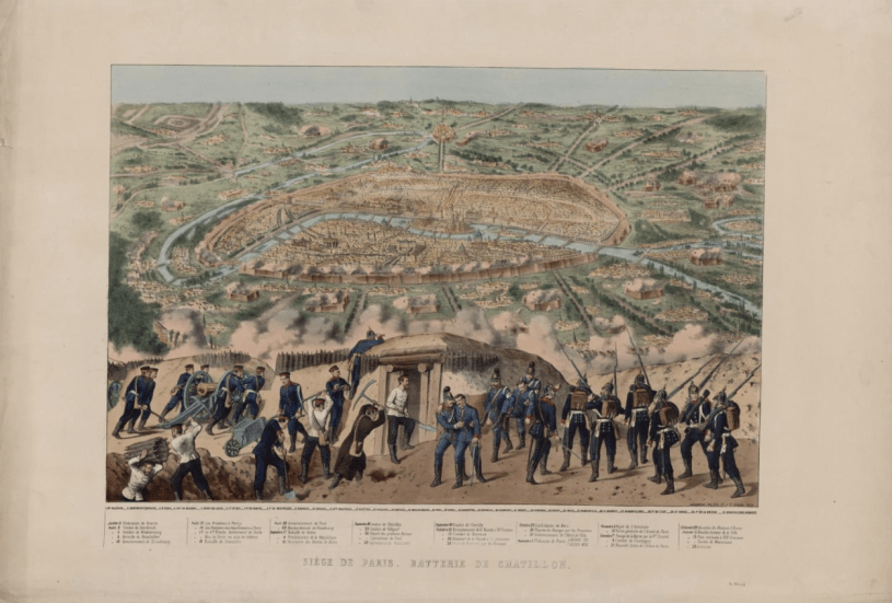 Paris enfermé dans ses fortifications vu de la batterie (et pas bataille) de Châtillon (ici aux mains des Prussiens me semble-t-il) en couverture de cet article est au musée Carnavalet.
