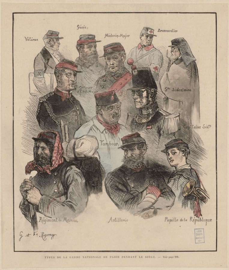 Sur la couverture de cet article, les types de la garde nationale, dessinés par Guillaume Régamey (ce n’est pas l’artiste qui a dessiné l’entête du Père Duchêne mais son frère), qui n’incluent pas le commandant. Je les ai trouvés au musée Carnavalet.