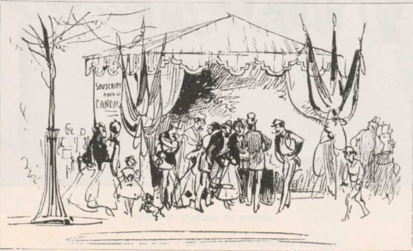 N’anticipons pas, nous sommes toujours au siège de Paris, et peut-être quête-t-on encore pour fondre des canons? Je ne connais pas la date exacte du dessin de Robida que j’ai choisi comme image de couverture, on quêtait ce jour-là devant l’Ambigu (boulevard du Temple), mais il est dans le livre de Dayot, sur Gallica, là.
